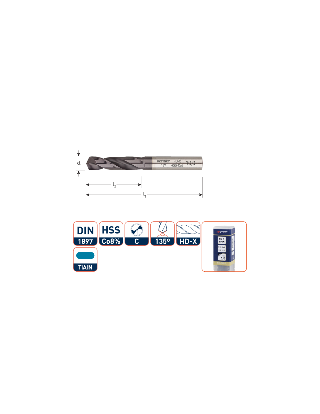High-Performance HSS-Co8% plaatwerkboor DIN 1897, Type HD-X, geslepen uitvoering, kernversterkt, tophoek 135°, kruisaanslijping volgens DIN 1412 Form C.