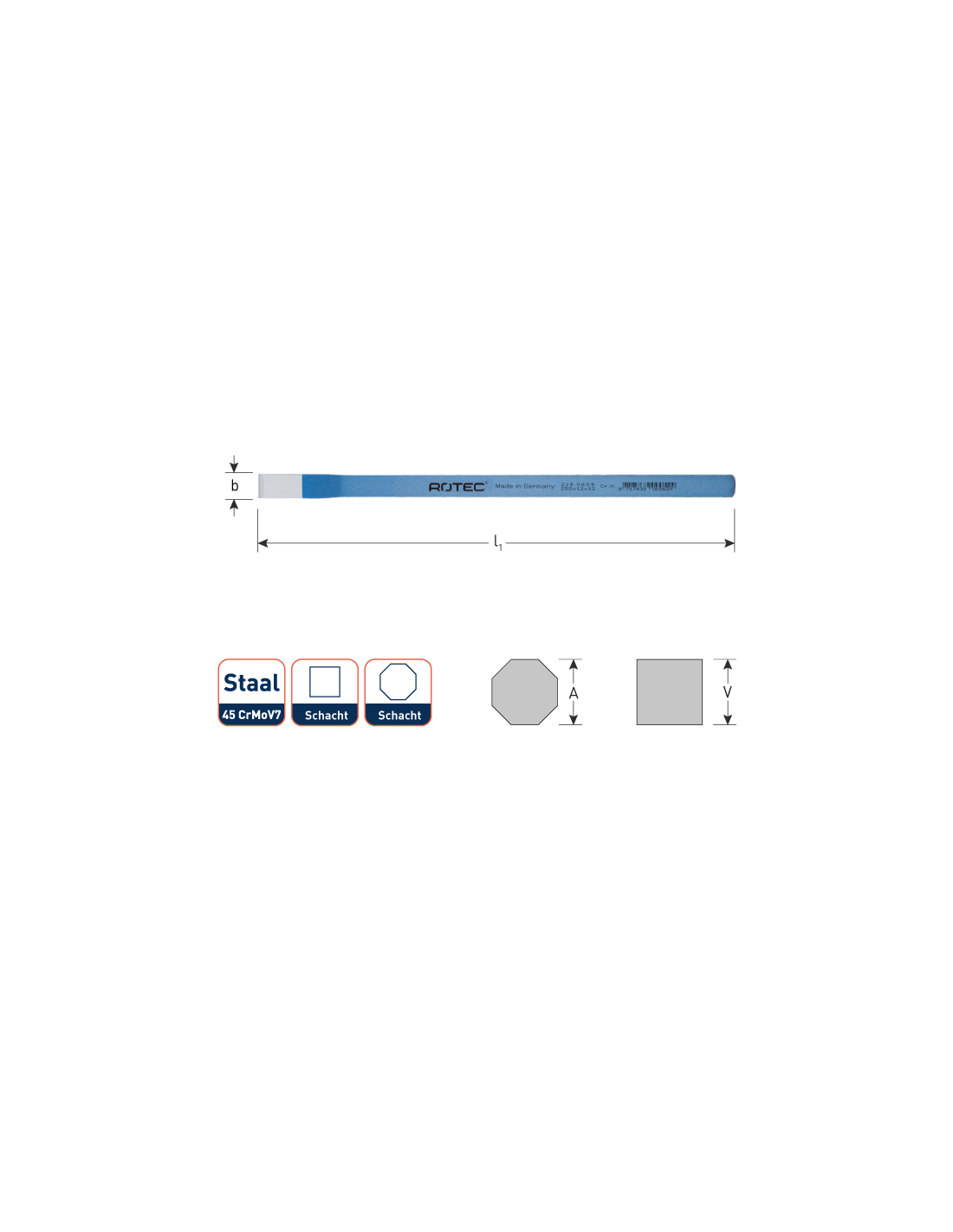 Luchtgehard chroom-molybdeen-vanadium-staal 45 CrMoV7, over de gehele lengte gelijkmatig doorgehard. Slagkop inductief ontlaten, voorkomt versplintering. 4-kantige schacht, laatste 3 modellen hebben een 8-kantige schacht.